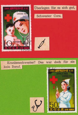 Das sind Charlotte Müller (Master of Art in Berlin) und Christine Gerlach (BA in Möbelgestaltung am Edinburgh College of Art). Die beiden verbindet nicht nur Sympathie und eine Leidenschaft für Schokolade, sondern auch ein obsessives Sammel-verhalten und die Vorliebe für alte Handarbeitstechniken. In ihrem Atelier studieren sie Lebensratgeber aus den Fünfziger Jahren, alte Biologiebücher, Groschenromane und Frauenzeitschriften, deren Bruchstücke in ihren Arbeiten wieder auftauchen. In Collagen, Illustrationen und genähten oder auch gestickten Objekten bekommen die Einzelteile neue und unerwartete Inhalte. Die Künstlerinnen setzen sich so mit den soziokulturellen Vermächtnissen der Generationen ihrer Mütter und Großmütter auseinander. www.schnee-weisschen.de |